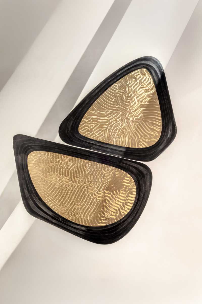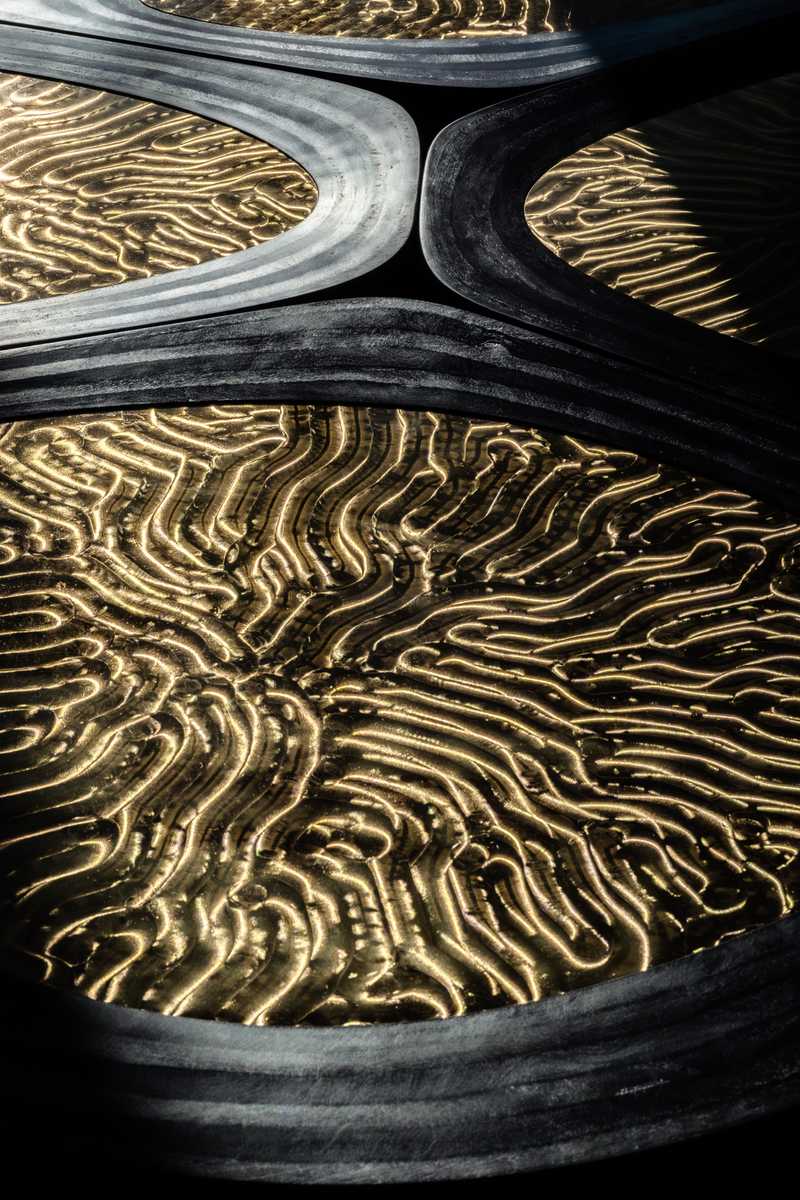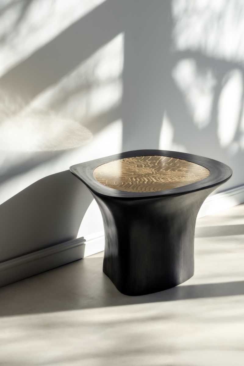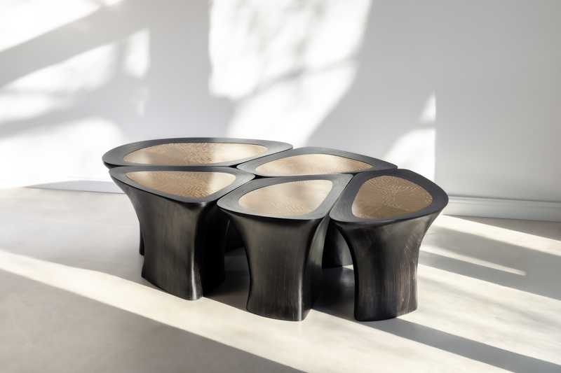 The modular coffee table continues the research initiated with the Linkana Cellule consoles, exploring organically derived forms combined with structural lightness. Composed of independent yet interconnected modules, it can function as a unified surface or be arranged freely in space. Each element follows a ‘cellular’ logic, with hand-shaped plywood bases supporting tabletops with clearly defined boundaries. Organic contours evoke natural growth patterns, while central insets of specially milled brass introduce a refined material contrast, highlighting the dialogue between craft, innovation, and precision– central to the artist’s practice.