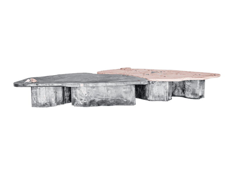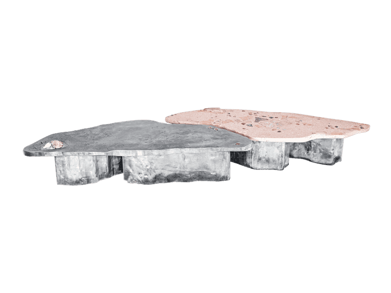 "Inari” is an object inspired by the natural processes of rock erosion – where stones, detached from their original formations, are carried by river currents and polished by nature’s forces. One table, made of aluminum, preserves the raw, unpolished mass of stones, showcasing their rugged authenticity, while the other, with a pink terrazzo top, conceals polished agates, jaspers, moonstones, and quartz. Together, these objects tell a story of constant transformation, where the force of the elements meets human sensitivity, creating a dialogue between nature’s rawness and its refined expression.