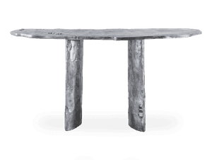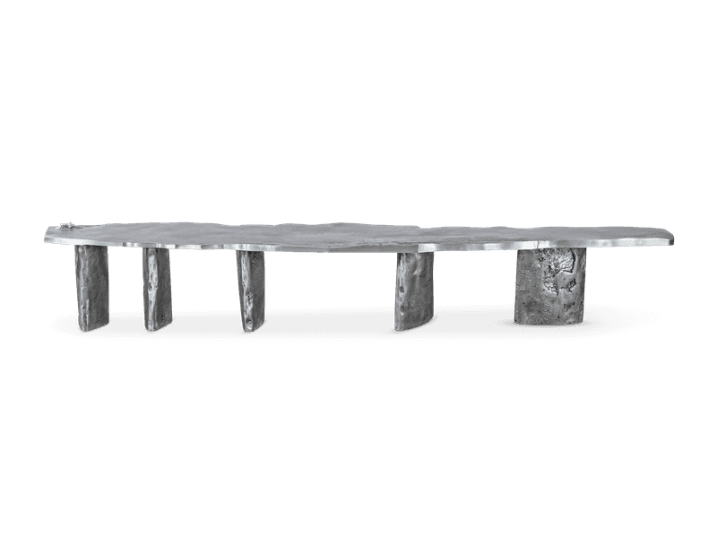 Ren is a collector’s item crafted entirely as an aluminum casting. Its slender, irregular tabletop shape is supported by five sturdy, elliptical legs. The raw texture of the cast aluminum transitions smoothly into sleek, refined surface areas. Embodying elements of primitivism, this low table also exudes a distinctly contemporary, brutalist feel. Amethyst, a powerful and harmonizing stone, adds a mystical aura to this unique piece.