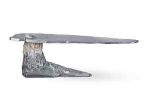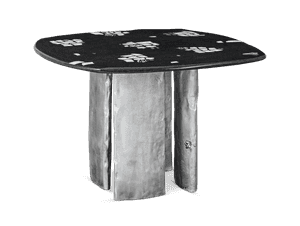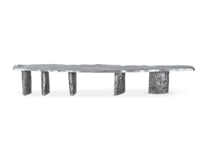 Saimaa is a collector’s item crafted entirely as an aluminum casting. Its slender, irregular tabletop shape is supported by sturdy, elliptical legs. The raw texture of the cast aluminum transitions smoothly into sleek, refined surface areas. Embodying an element of primitivism, the console also exudes a distinctly contemporary feel. Minerals have been embedded in both the legs and the tabletop of the console. Zebra quartz, with its energy-transforming properties, adds a mystical aura to Formsophy’s sculptural pieces through stone inlays, turning them into magical objects.